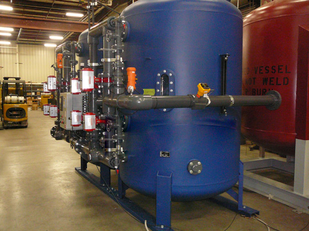 水處理的沉淀和澄清過程,把水中一部分較大的固體顆粒或容易沉降的雜質加以去除,但要進一步使水凈化,就得利用過濾的方法,使水通過石英砂過濾器中從上而下、由小而大的不同顆粒的濾料層后,將水中的細小顆粒、膠體、有機物等雜質截留下來,從而使水得到進一步的澄清和凈化,降低水的渾濁度。根據設備水頭損失的情況或過濾器運行的時間確定石英砂過濾器的反沖時機。通過石英砂過濾器上所配置的各類閥體的開合對設備內部石英砂濾料進行反沖洗,將沉積在介質上的雜物沖洗干凈后,設備隨即又進入了一個新的過濾周期。