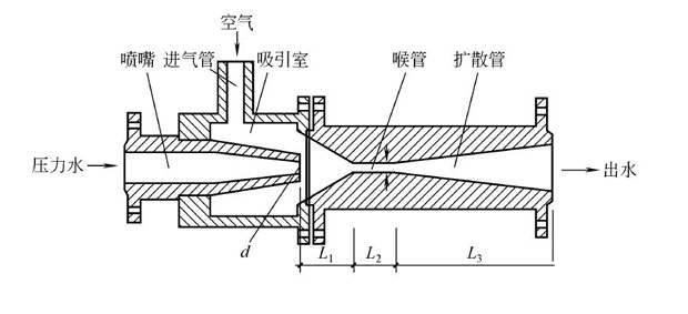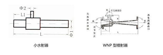 高壓原水通過管道閥門進入噴射器的漸縮段,將靜壓頭轉換成動能,在噴嘴處成為高速射流,使混合室形成微真空狀態,將高濃度的再生藥液吸入混合室,并使再生藥液的壓力和速度發生變化;在混合段內,水和藥液得到充分地混合,然后注經擴散段,使再生液減低流速,靜壓頭升高,再通過出口管道及閥門將稀再生液送到交換器本體中。